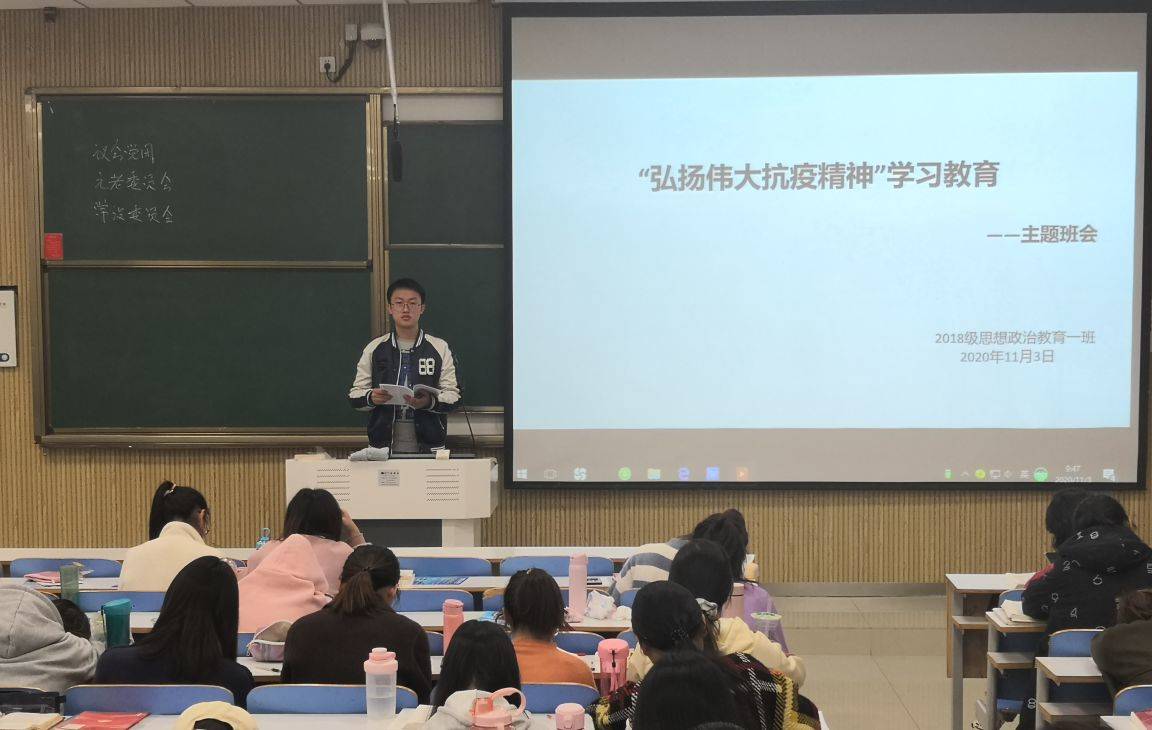 11月3日上午,小说狂人 2018级思想政治教育一班在社科楼515教室顺利开展“弘扬伟大抗疫精神”主题班会。2018级思想政治教育一班全体同学共同参加此次会议。会议由班长邢子豪主持。