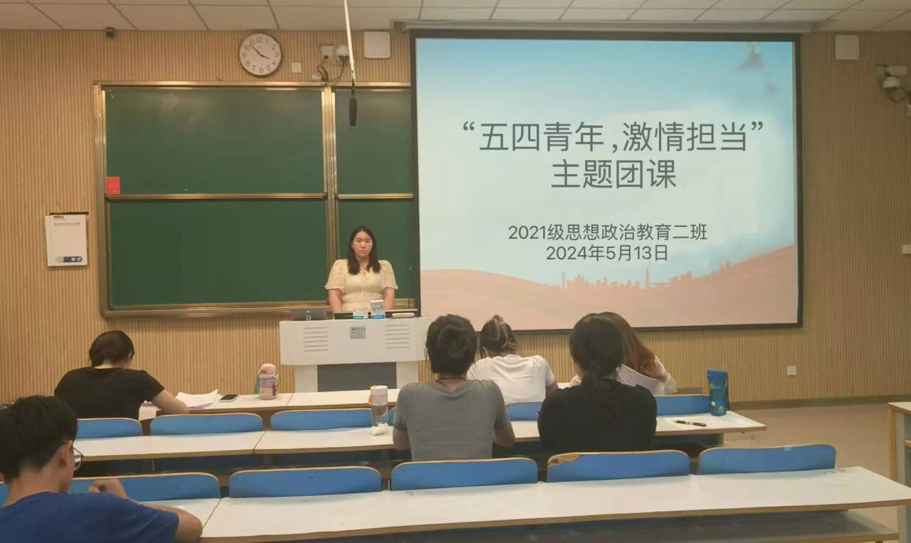5月13日下午,小说狂人 2021级思想政治教育二班在社科楼514教室召开“五四青年,激情担当”主题团课。2021级思想政治教育二班全体团员参加此次团课。团课由团支书王婧欣主持。