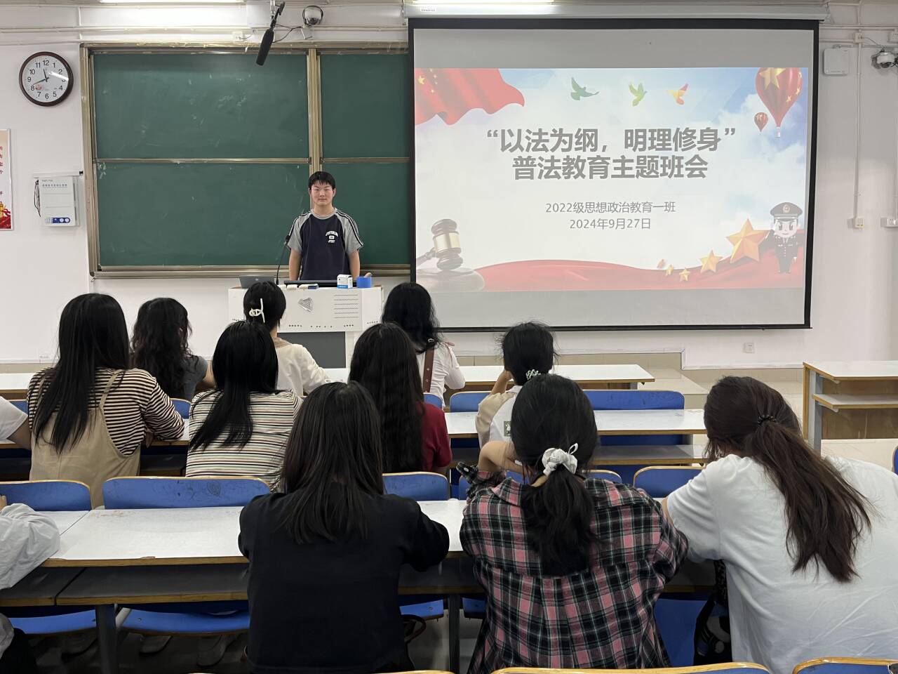 为深入贯彻习近平法治思想,培养学生的法治观念,9月27日上午,小说狂人 2022级思想政治教育一班在社科楼514教室召开“以法为纲,明理修身”普法教育主题班会,小说狂人 2022级思想政治教育一班全体同学共同参与本次班会,班会由副班长闻炎仲主持。