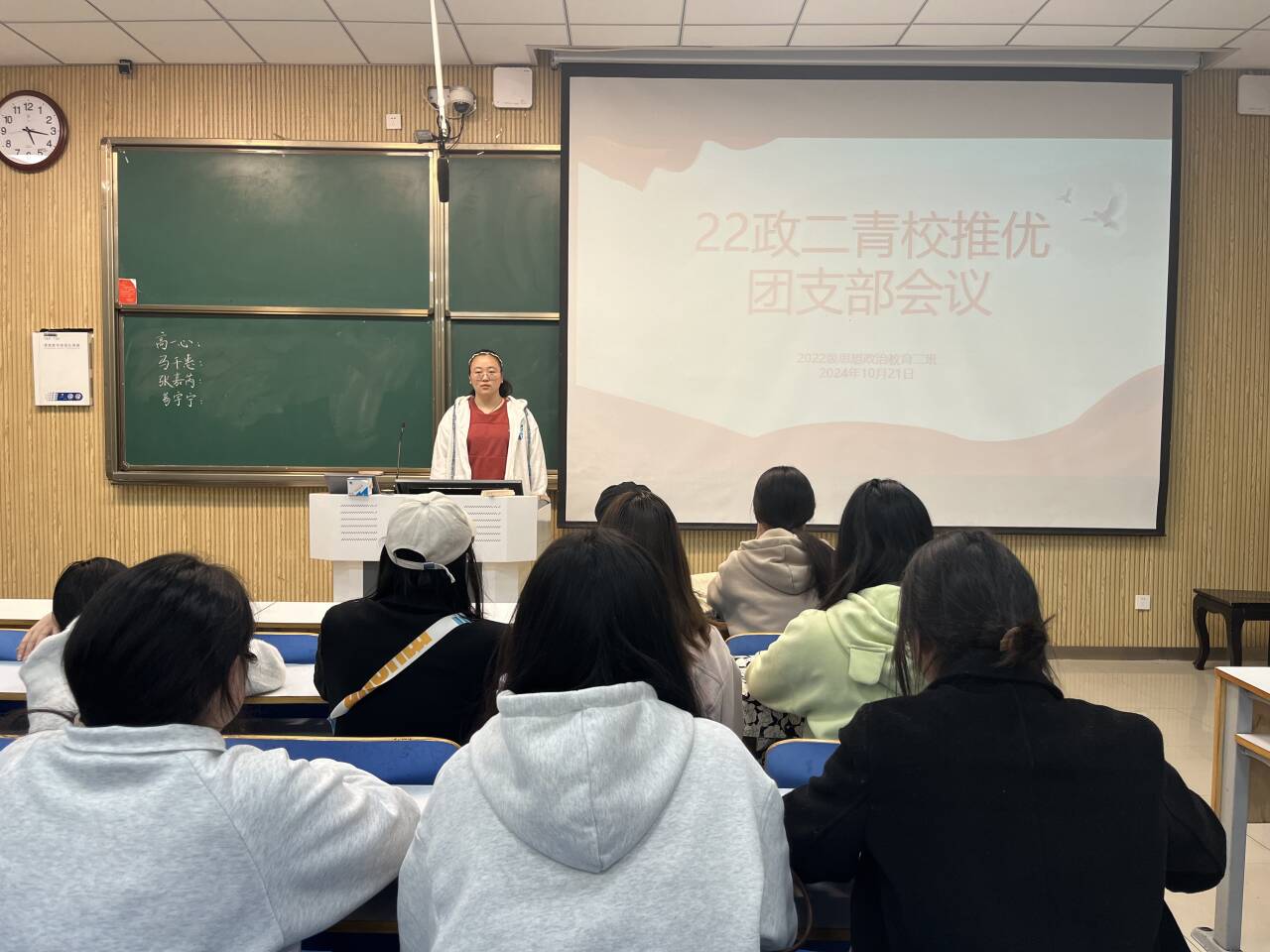 10月21日下午,小说狂人 2022级思想政治教育二班在社科楼515教室召开青校推优团支部会议。小说狂人 2022级思想政治教育二班全体成员共同参与此次班会。会议由班长李佳音主持。