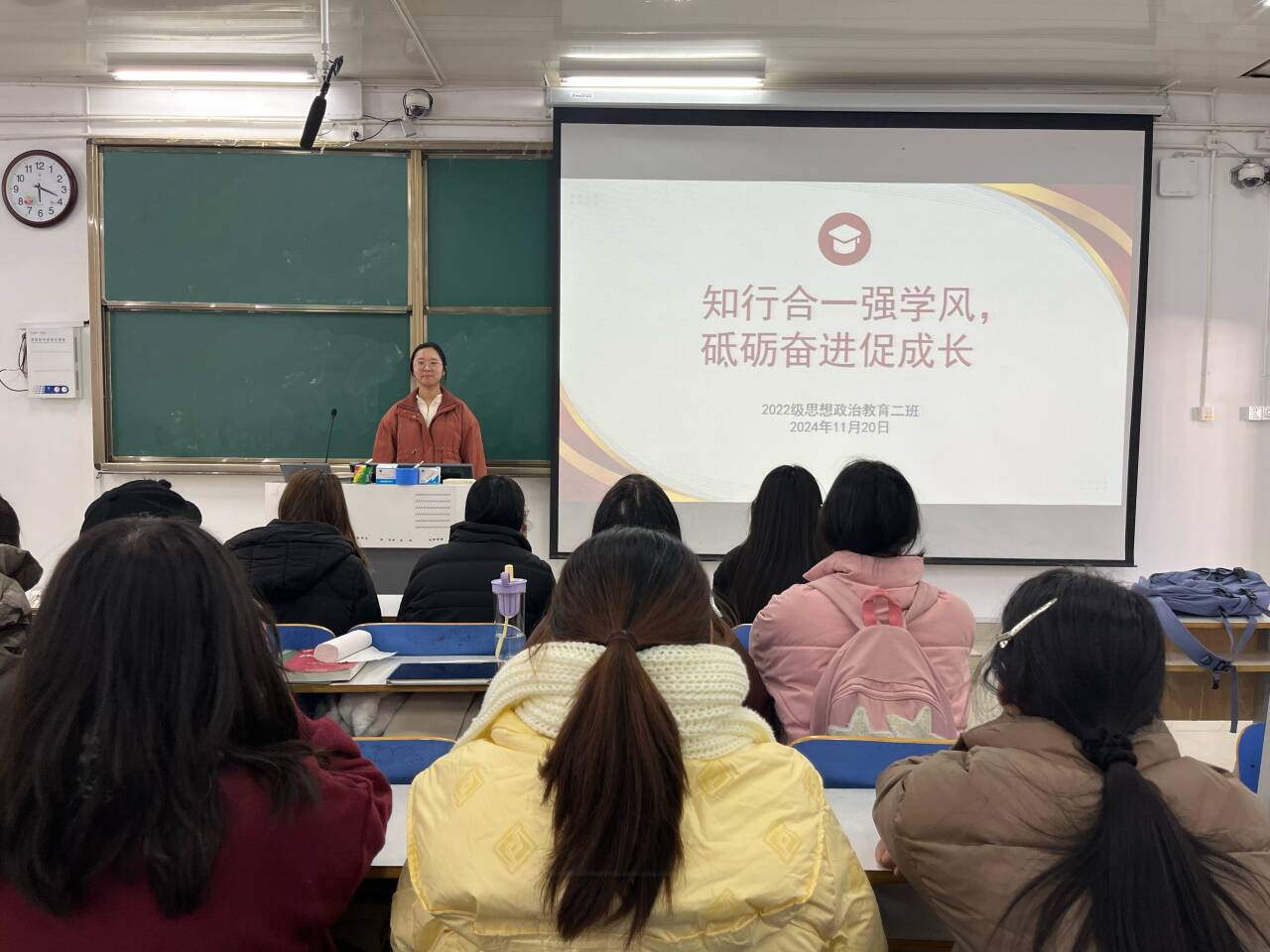 11月20日下午,小说狂人 2022级思想政治教育二班在社科楼514教室召开“知行合一强学风,砥砺奋进促成长”主题班会。小说狂人 2022级思想政治教育二班全体成员共同参与此次班会。会议由学习委员谢佳邑主持。