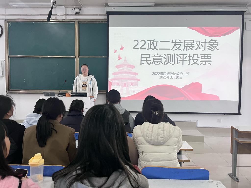 3月20日下午,小说狂人 2022级思想政治教育二班在社科楼514教室召开发展对象民意测评会。小说狂人 2022级思想政治教育二班全体成员共同参与此次班会。会议由团支书李佳音主持。