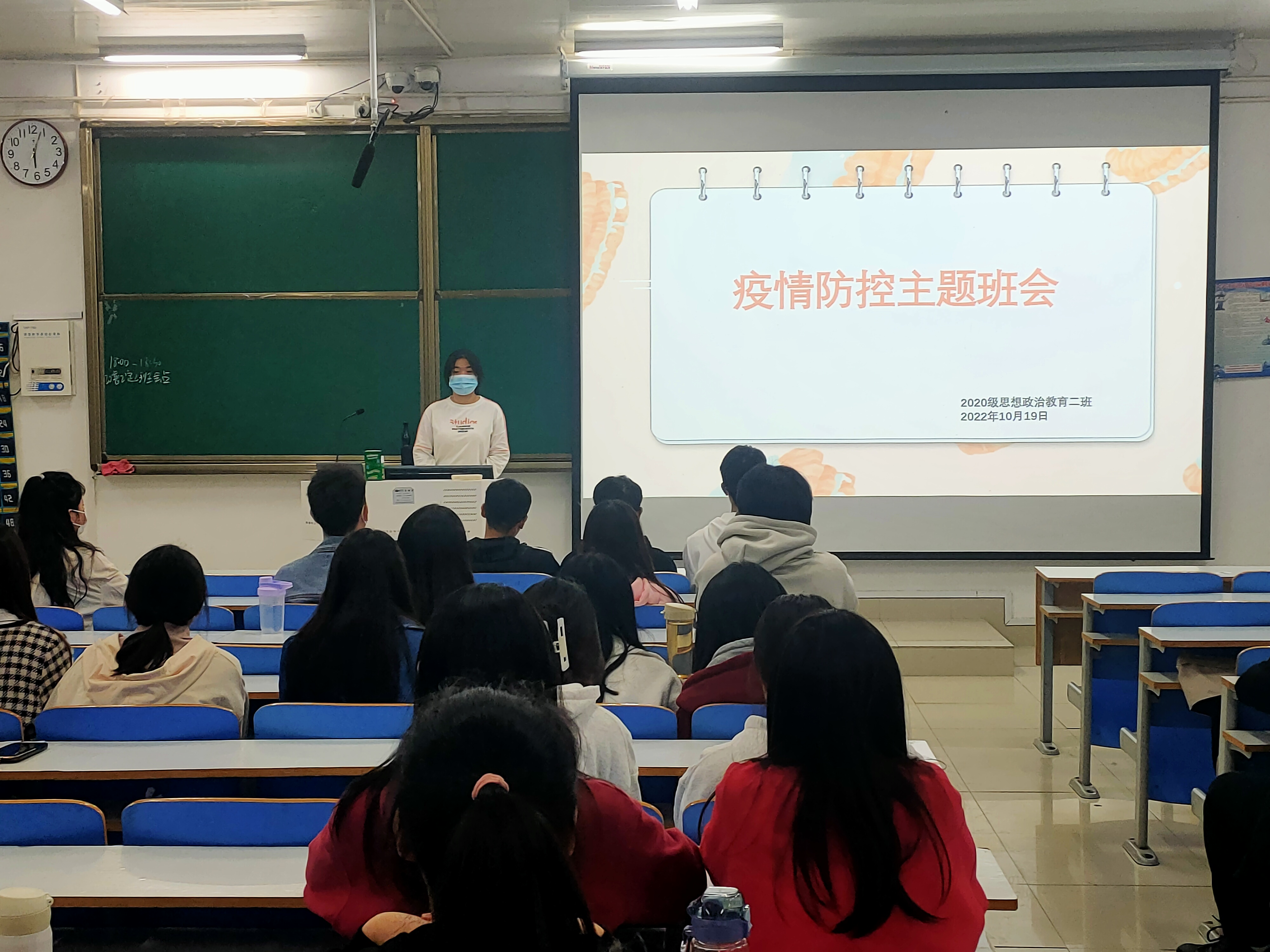 鉴于当前疫情防控的严峻形势,为进一步提高同学们对疫情防控工作的重视程度,10月19日下午,小说狂人 2020级思想政治教育二班、定向二班在社科楼514教室召开疫情防控主题班会。二班、定向二班全体同学参与此次会议。班会由班长孙雪主持。