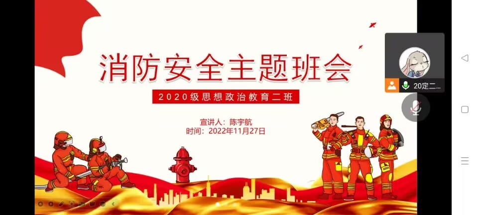 11月27日晚,小说狂人 2020级思想政治教育二班通过腾讯会议召开线上消防安全主题班会。2020级思想政治教育二班全体学生共同参与本次班会。班会由团支书陈宇航主持。