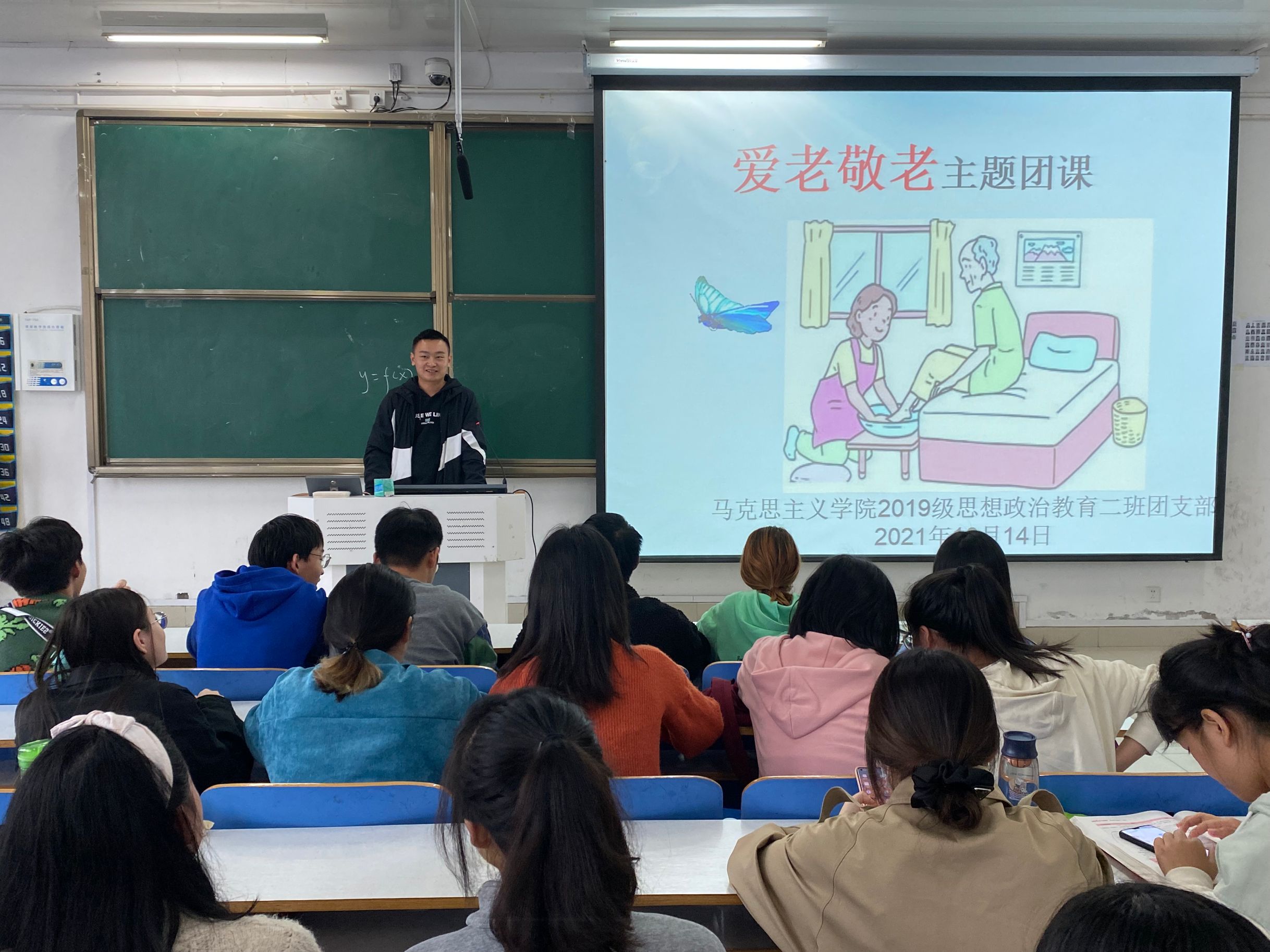 九九重阳至,浓浓敬老情。10月14日上午,小说狂人 2019级思想政治教育二班于社科楼516教室召开“爱老敬老”主题团课。2019级思想政治教育二班全体学生共同参会。会议由卫生委员刘鹏主持。