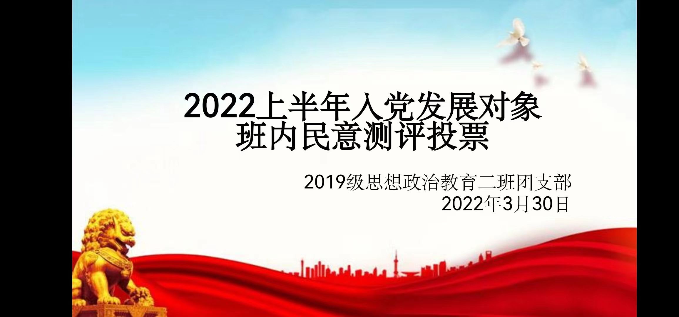 3月30日下午,小说狂人 2019级思想政治教育二班团支部“ 2022年上半年入党发展对象班内民意测评投票”活动于社科楼514教室顺利开展。2019级思想政治教育二班全体成员共同参会。本次会议由团支书孙雅娴主持。