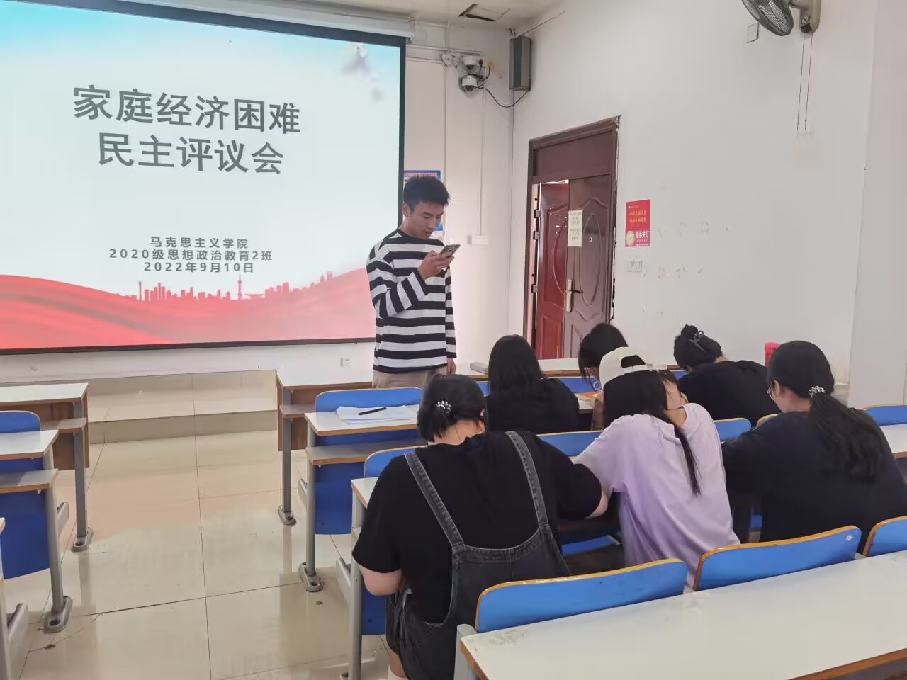 9月10日下午,小说狂人 2020级思想政治教育二班、定向二班在社科楼514教室召开2022年家庭经济困难学生认定民主评议会。辅导员陶青青出席会议,评议小组成员悉数到会。会议由班长高红凯主持。
