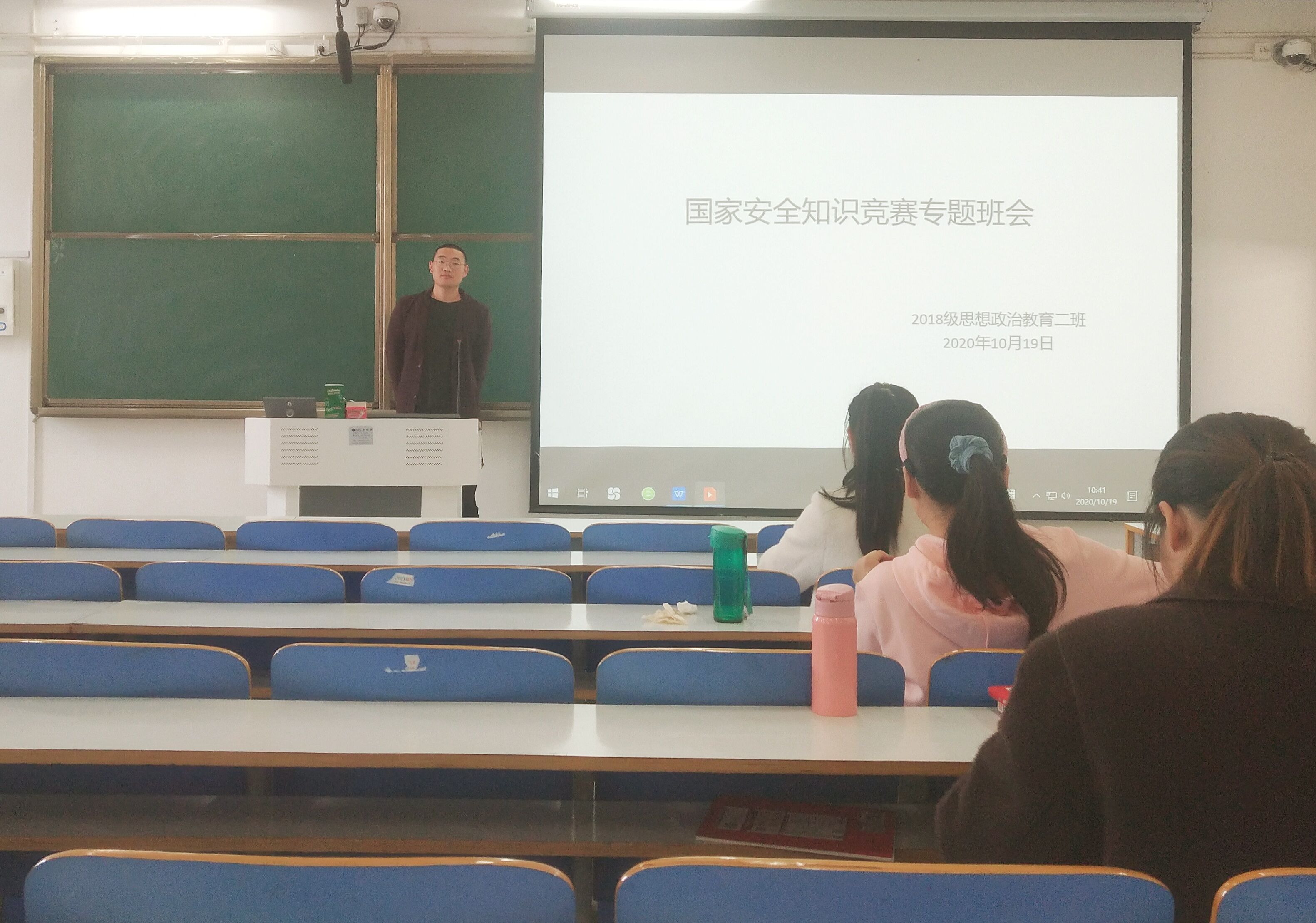 10月19日上午,小说狂人 2018级思想政治教育二班在社科楼514教室顺利开展“国防安全知识竞赛”专题班会。2018级思想政治教育二班全体成员共同参加了此次班会。会议由班长杨康主持。