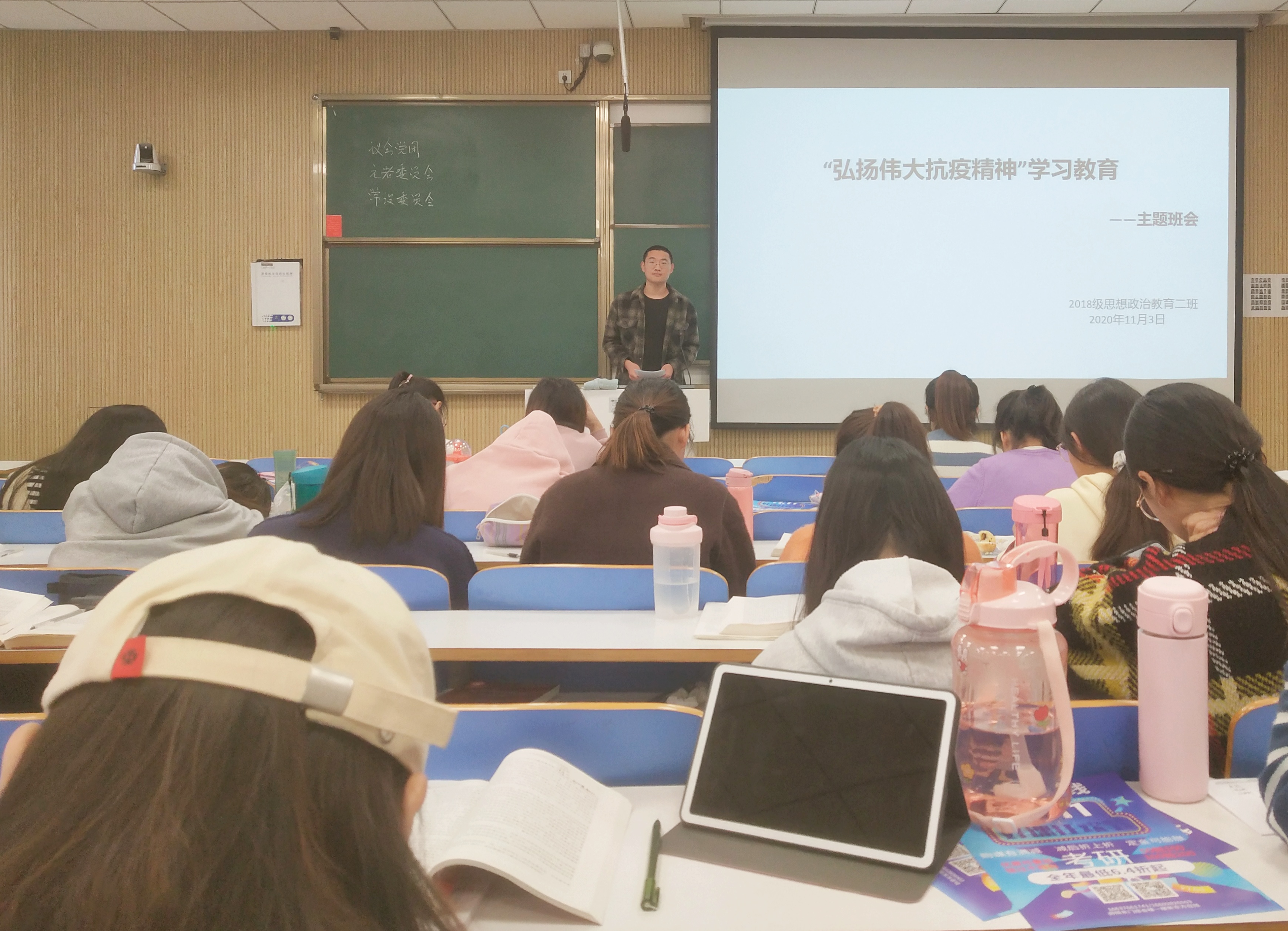 11月3日上午,小说狂人 2018级思想政治教育二班在社科楼515教室顺利开展主题为“弘扬伟大抗疫精神”学习教育主题班会。会议由班长杨康主持。