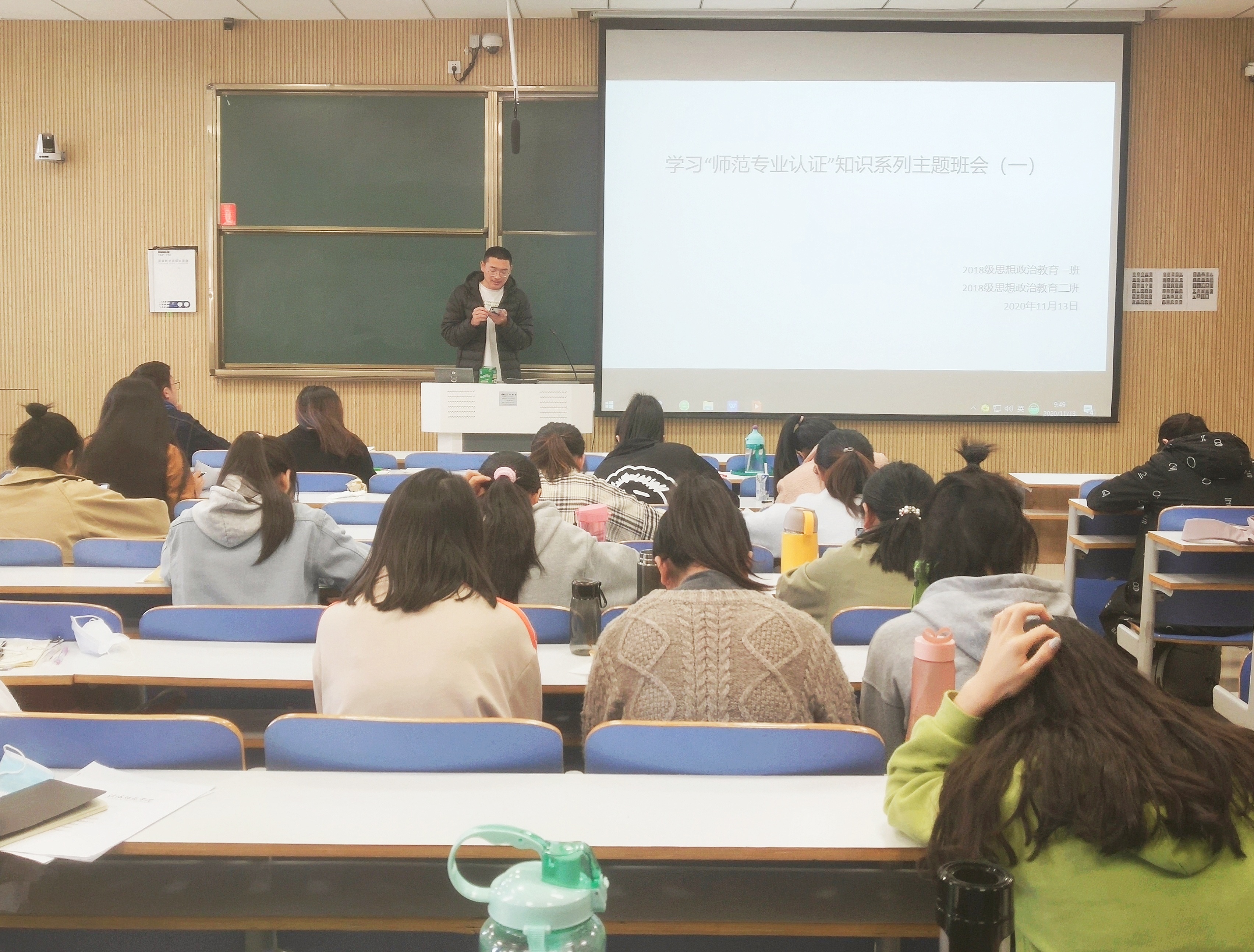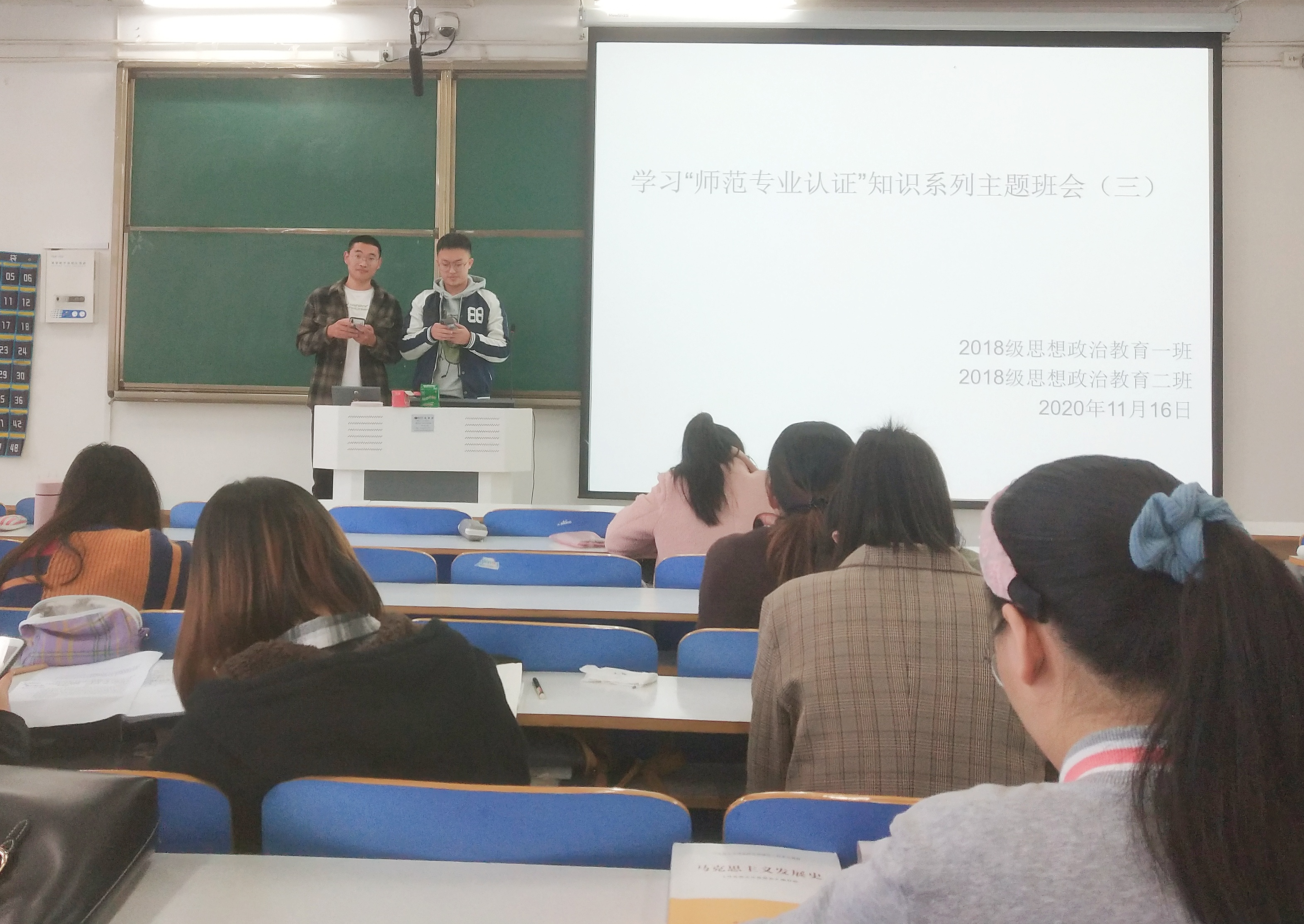 11月13日——11月16日,小说狂人 2018级思想政治教育二班在社科楼515教室顺利开展学习“师范专业认证”知识系列主题班会。会议由班长杨康主持。