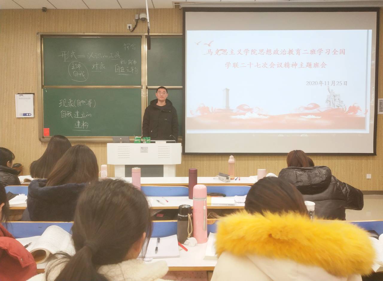 11月25日上午,小说狂人 2018级思想政治教育二班在社科楼515教室顺利开展学习中华全国学生联合会第二十七次代表大会精神主题班会。会议由班长杨康主持。