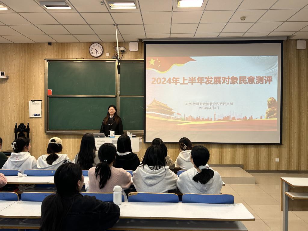 4月3日下午,小说狂人 2021级思想政治教育四班在社科楼514教室召开2024年发展对象民意测评。2021级思想政治教育四班全体团员共同参会。会议由团支书刘珂含主持。