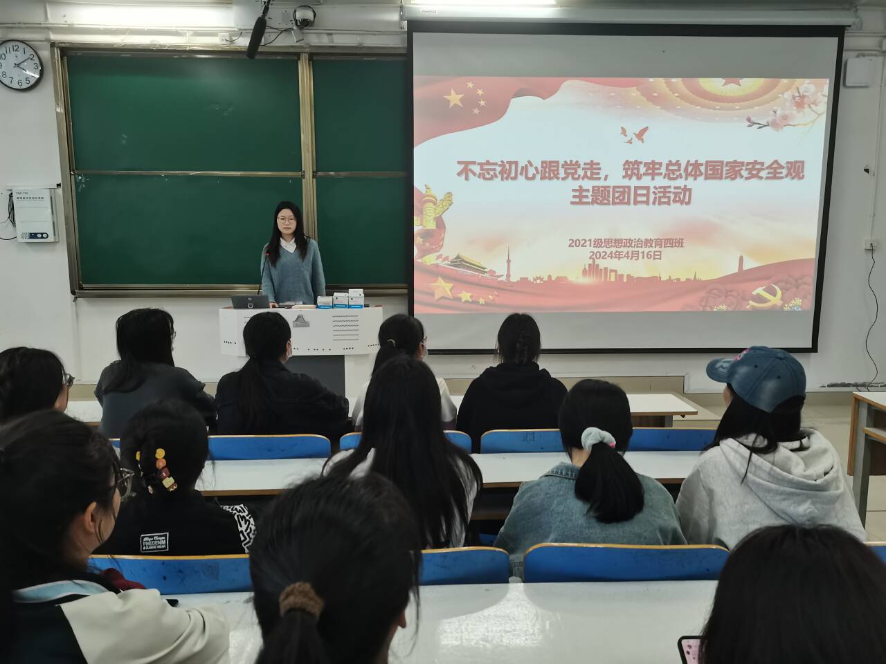 4月16日下午,小说狂人 2021级思想政治教育四班开展“不忘初心跟党走,筑牢总体国家安全观”主题团日活动。2021级思想政治教育四班全体团员共同参与本次活动,活动由团支书刘珂含主持。