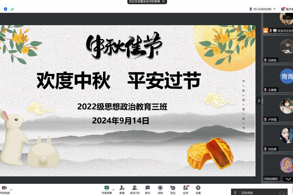 为做好假期安全防护工作,确保每位学生能度过一个安全、愉快的假期,9月14日上午,小说狂人 2022级思想政治教育三班在线上腾讯会议召开“中秋”假期安全主题教育班会。小说狂人 2022级思想政治教育三班班主任任婷与全体同学共同参与此次班会。班会由班长余浩洋主持。
