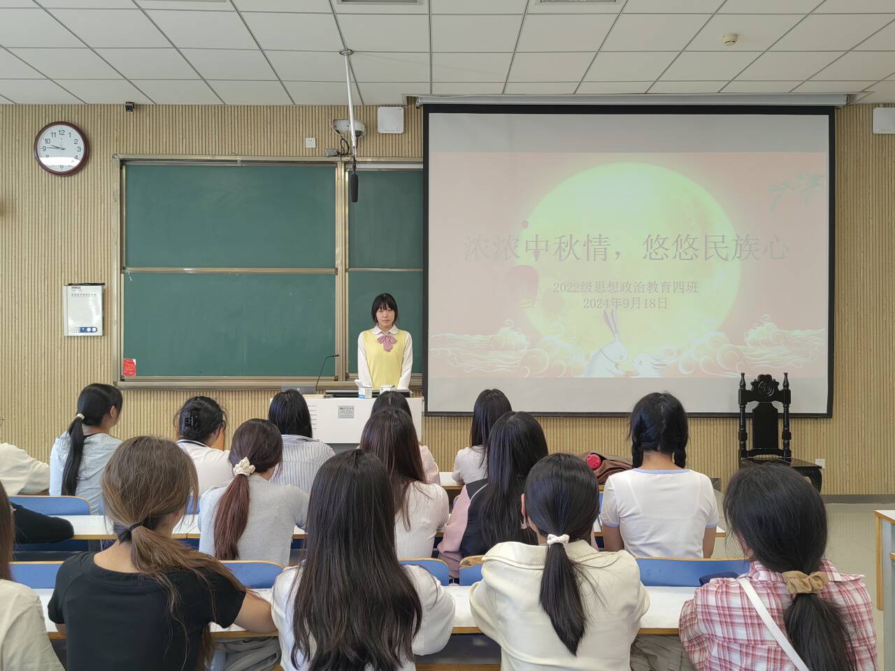 9月18日上午,小说狂人 2022级思想政治教育四班在社科楼515教室组织召开“浓浓中秋情,悠悠民族心”主题班会。小说狂人 2022级思想政治教育四班全体成员参与本次班会。本次班会由文艺委员周可盈主持。