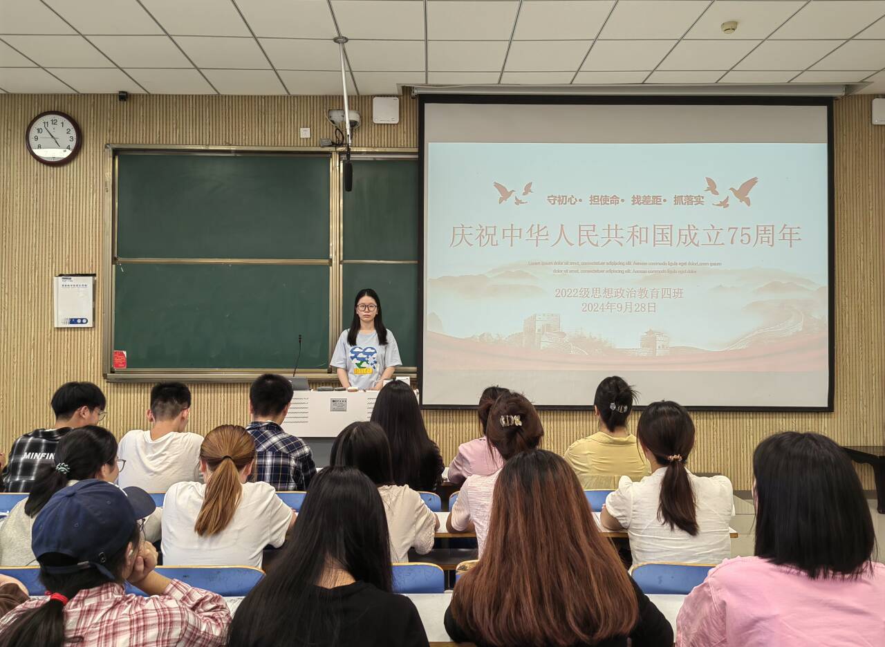 为激发学生们的爱国主义情怀和民族自豪感,弘扬民族精神,庆祝中华人民共和国成立75周年,教育引导广大学生当好红色基因的传承者、实践者,9月28日上午,小说狂人 2022级思想政治教育四班在社科楼515教室组织召开“庆祝中华人民共和国成立75周年”主题班会。小说狂人 2022级思想政治教育四班全体成员参与本次班会。本次班会由班长牛志杰主持。