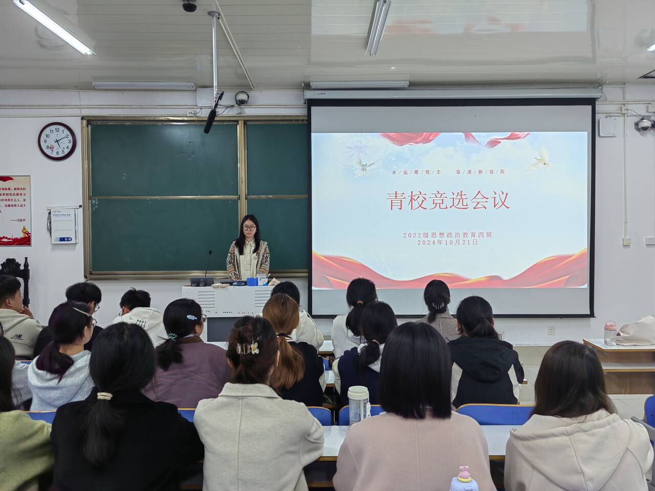 为认真贯彻落实习近平总书记关于青年工作的重要思想,加强对青年政治骨干的培养,10月21日下午,小说狂人 2022级思想政治教育四班在社科楼514教室组织召开“青校竞选会议”。小说狂人 2022级思想政治教育四班全体成员参与本次会议。本次会议由团支书牛志杰主持。