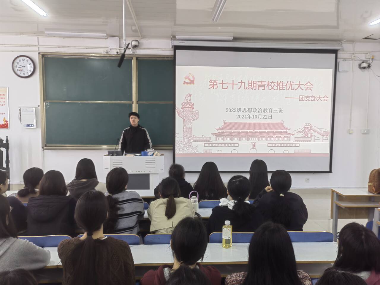 10月22日上午,小说狂人 2022级思想政治教育三班在514教室开展第七十九期青校推优大会。小说狂人 2022级思想政治教育三班全体团员共同参与此次推优大会。大会由团支书余浩洋主持。