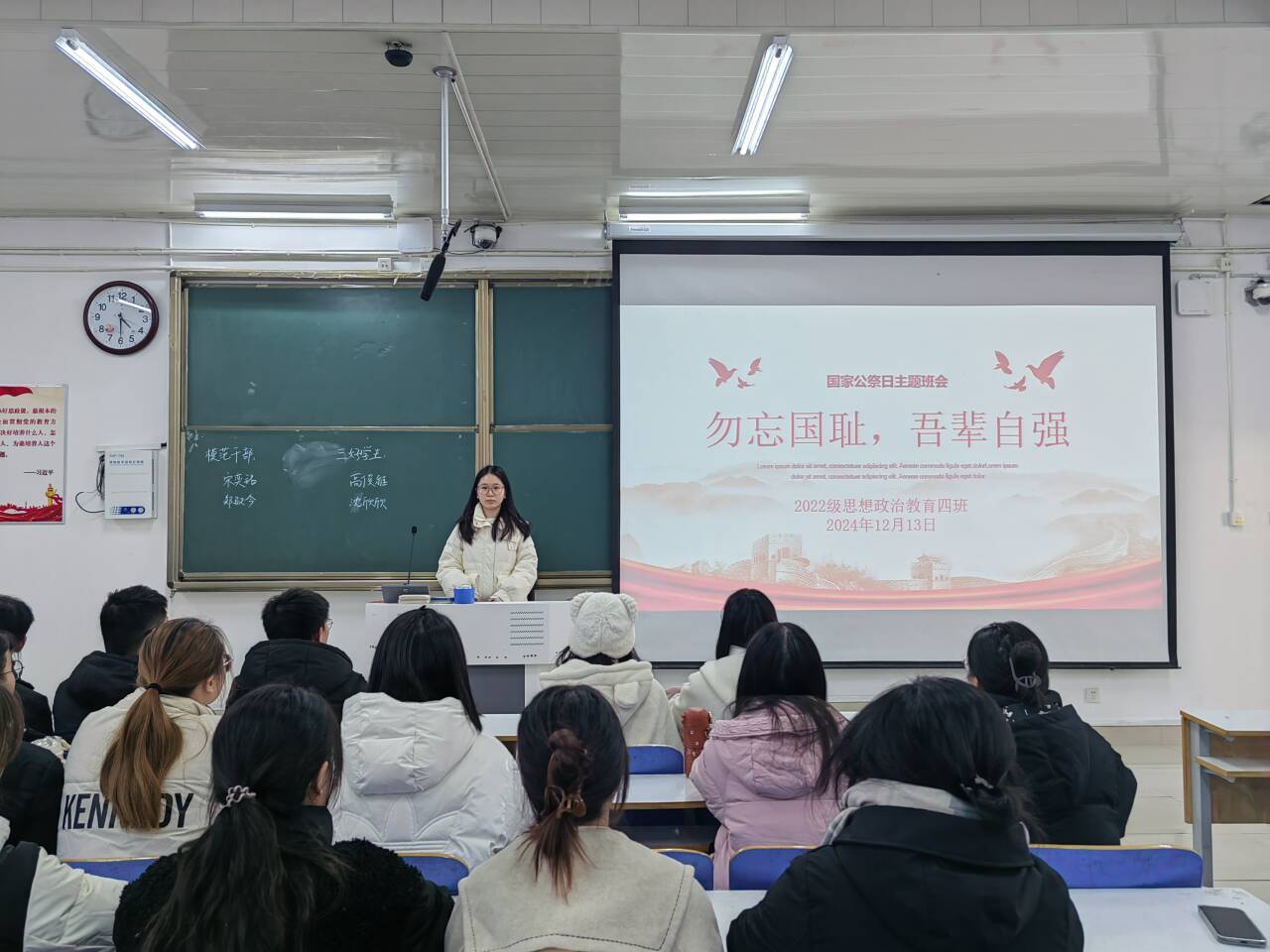 12月13日下午,小说狂人 2022级思想政治教育四班在社科楼514教室组织召开“勿忘国耻,吾辈自强”主题班会。小说狂人 2022级思想政治教育四班全体成员参与本次班会。本次班会由班长牛志杰主持。