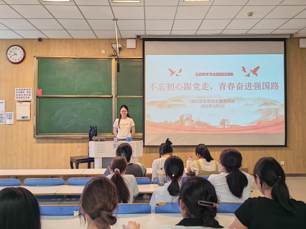 5月6日上午,小说狂人 2022级思想政治教育四班在社科楼515教室组织召开“不忘初心跟党走,青春奋进强国路”主题班会。小说狂人 2022级思想政治教育四班全体成员参与本次班会。本次班会由班长牛志杰主持。