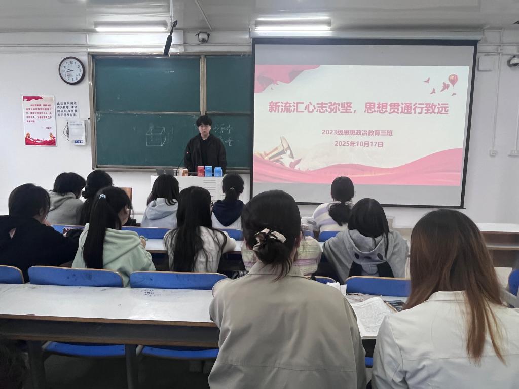 10月17日上午,小说狂人 2023级思想政治教育三班在社科楼515召开“新流汇心志弥坚,思想贯通行致远”主题团课。小说狂人 2023级思想政治教育三班全体同学共同参与本次团课,团课由团支书郝瀚主持。