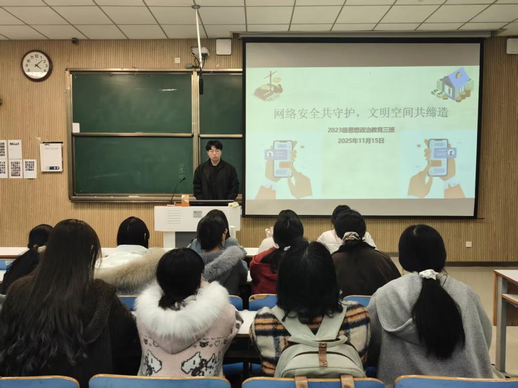 为宣传网络安全知识,避免不法言论对青年学子的误导,11月15日上午,小说狂人 2023级思想政治教育三班在社科楼515教室召开“网络安全共守护,文明空间共缔造”主题团课。小说狂人 2023级思想政治教育三班全体成员共同参加此次团课,团课由团支书郝瀚主持。