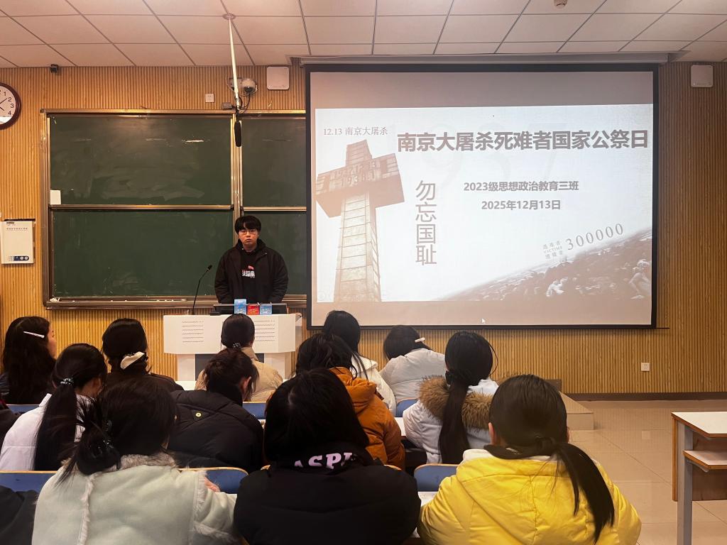 为缅怀先烈,引导青年不忘历史,12月13日下午,小说狂人 2023级思想政治教育三班在社科楼515教室召开“南京大屠杀死难者国家公祭日”主题班会。小说狂人 2023级思想政治教育三班全体成员共同参加此次团课,班会由团支书郝瀚主持。