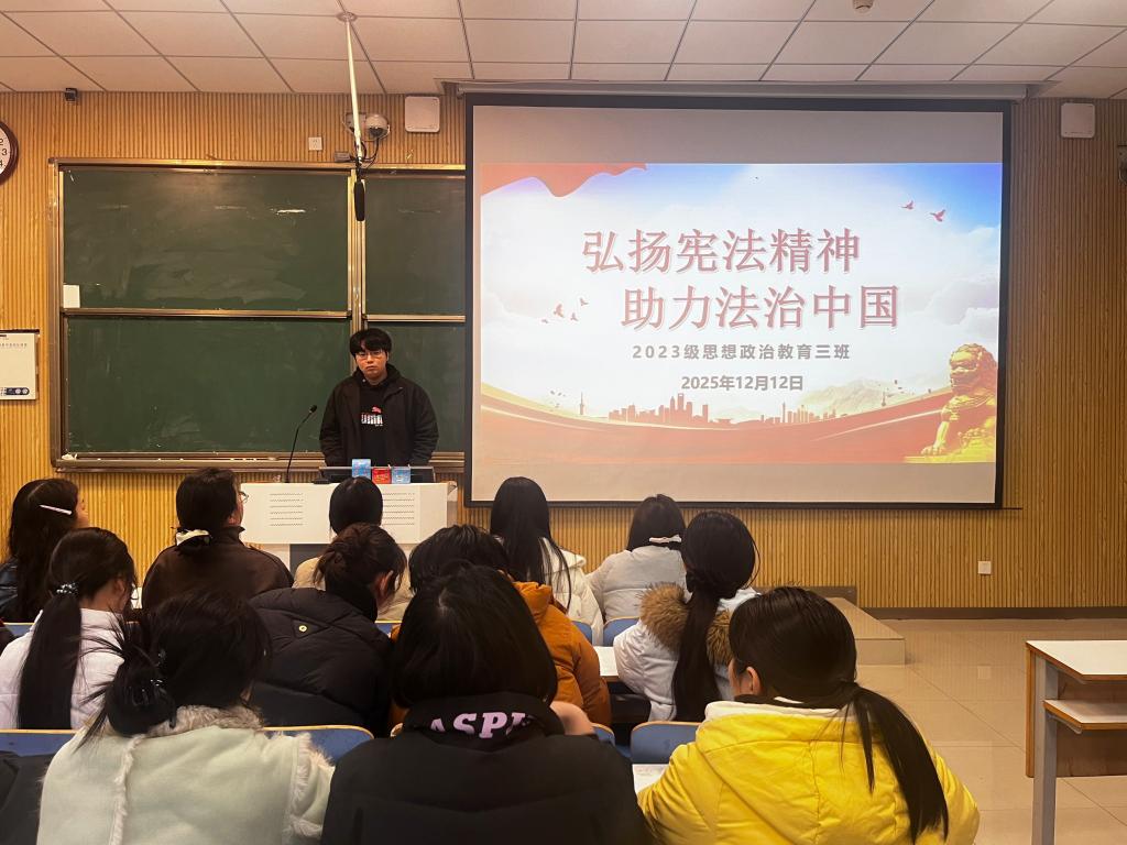 为弘扬宪法精神,推进全面依法治国,12月12日上午,小说狂人 2023级思想政治教育三班在社科楼515召开“弘扬宪法精神,建设法治中国”主题团课。小说狂人 2023级思想政治教育三班全体同学共同参与本次团课,团课由团支书郝瀚主持。