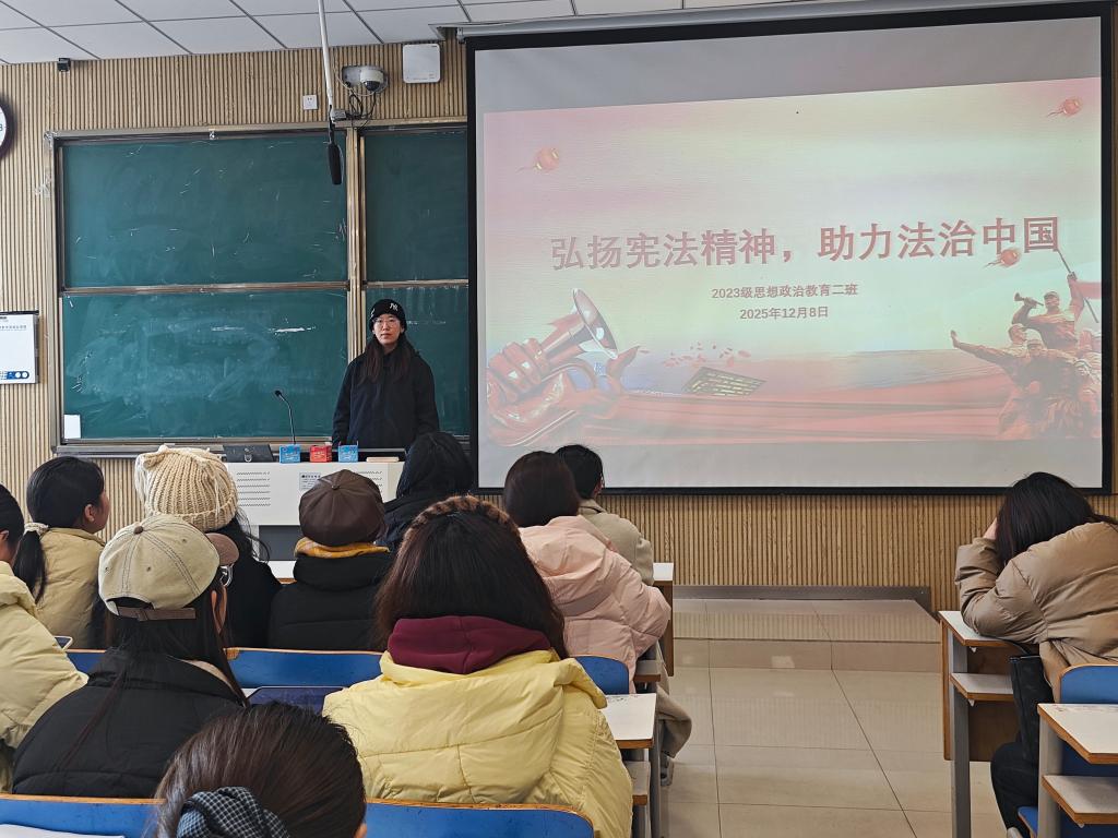 班会伊始,班长王慜初结合思想政治教育专业特色,阐明了法治精神与青年成长、基层治理及国家发展的深层关联。他指出,作为思政专业学子,不仅要做法治精神的学习者、遵守者,更应成为法治理念的传播者、践行者,以专业所学助力法治中国建设。 随后,班会围绕“法治典故品读”“法治案例研讨”“法治实践分享”三个环节有序推进。在案例研讨环节,同学们结合校园贷、网络言论边界等贴近生活的典型案例,展开热烈讨论,深入剖析法治在维护个人权益、规范社会秩序中的重要作用;在实践分享环节,部分参与过普法志愿服务的同学分享了基层普法经历,讲述了法治宣传在乡村、社区中的实际成效,让大家直观感受到法治精神从理论到实践的转化路径。 班会最后,全体同学共同发出倡议:要树立法治信仰,主动学习《宪法》《民法典》等法律法规;要践行法治准则,在日常学习生活中严守法律底线、恪守道德规范;要扛起青年担当,积极参与法治宣传活动,以实际行动为推进全面依法治国贡献青春力量。