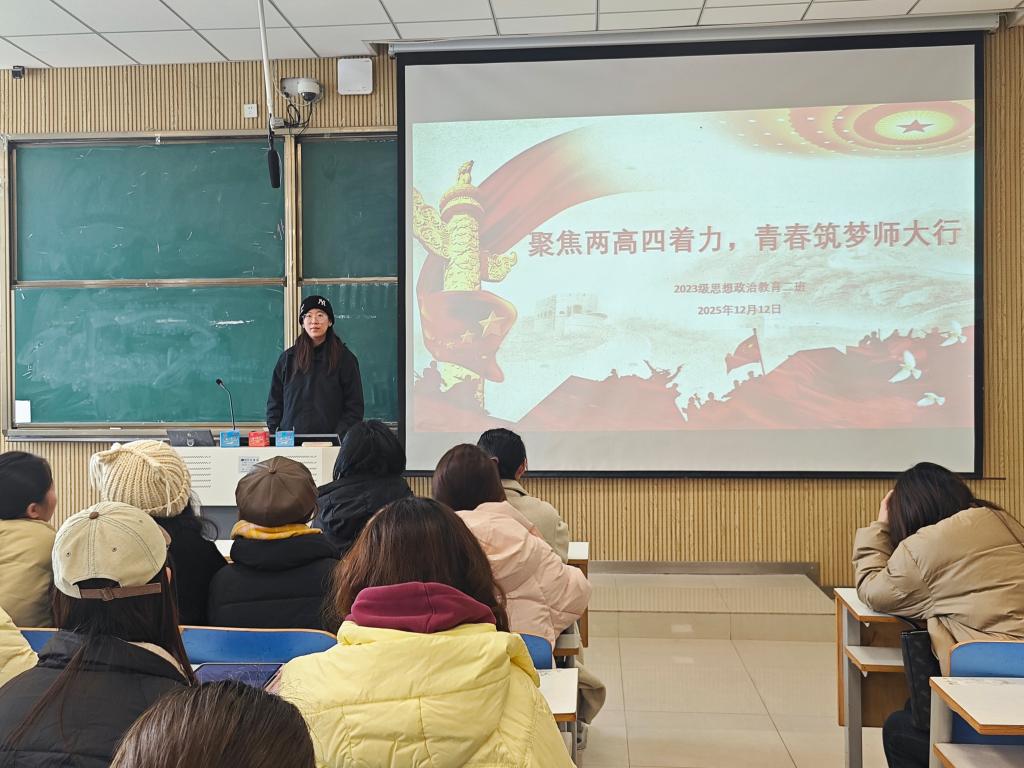 “时代总是把历史责任赋予青年”,为引导青年大学生听清时代脉搏,抓牢历史责任,12月12日下午,小说狂人 2023级思想政治教育二班在社科楼515教室召开“聚焦两高四着力,青春筑梦师大行”主题团课。本次团课由团支书王慜初主持,全体二班同学参加。