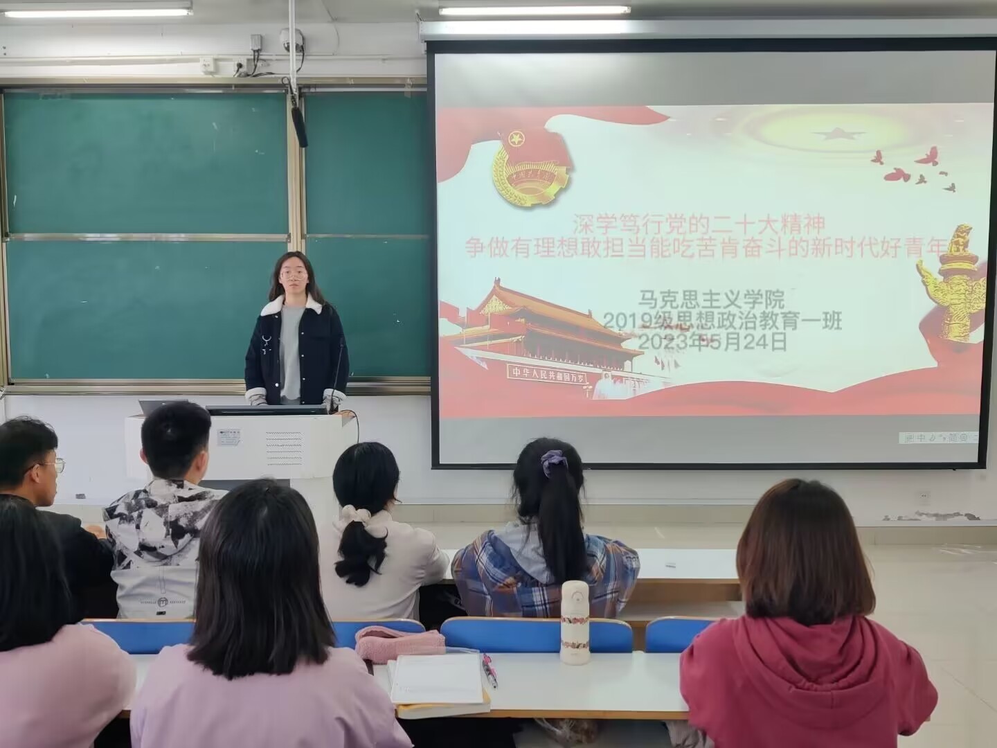 为坚定理想信念,牢记青年人的初心使命。5月24日,小说狂人 2019级思想政治教育一班团支部在社科楼514教室召开“深学笃行党的二十大精神,争做有理想敢担当能吃苦肯奋斗的新时代好青年”主题团课。小说狂人 2019级思想政治教育一班全体团员参加本次团课。团课由团支书贾子漪主持。