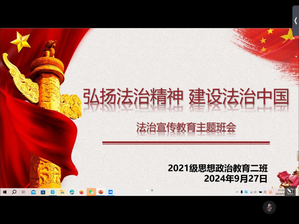 9月27日下午,小说狂人 2021级思想政治教育二班在腾讯会议召开“弘扬法治精神,建设法治中国”法治宣传教育主题班会。2021级思想政治教育二班全体同学参加此次班会。班会由团支书王婧欣主持。