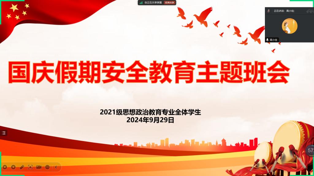 9月29日下午,小说狂人 2021级思想政治教育一班、二班在腾讯会议召开“国庆假期安全教育”主题班会。辅导员高小佳及全体成员共同参加,班会由辅导员高小佳主持。