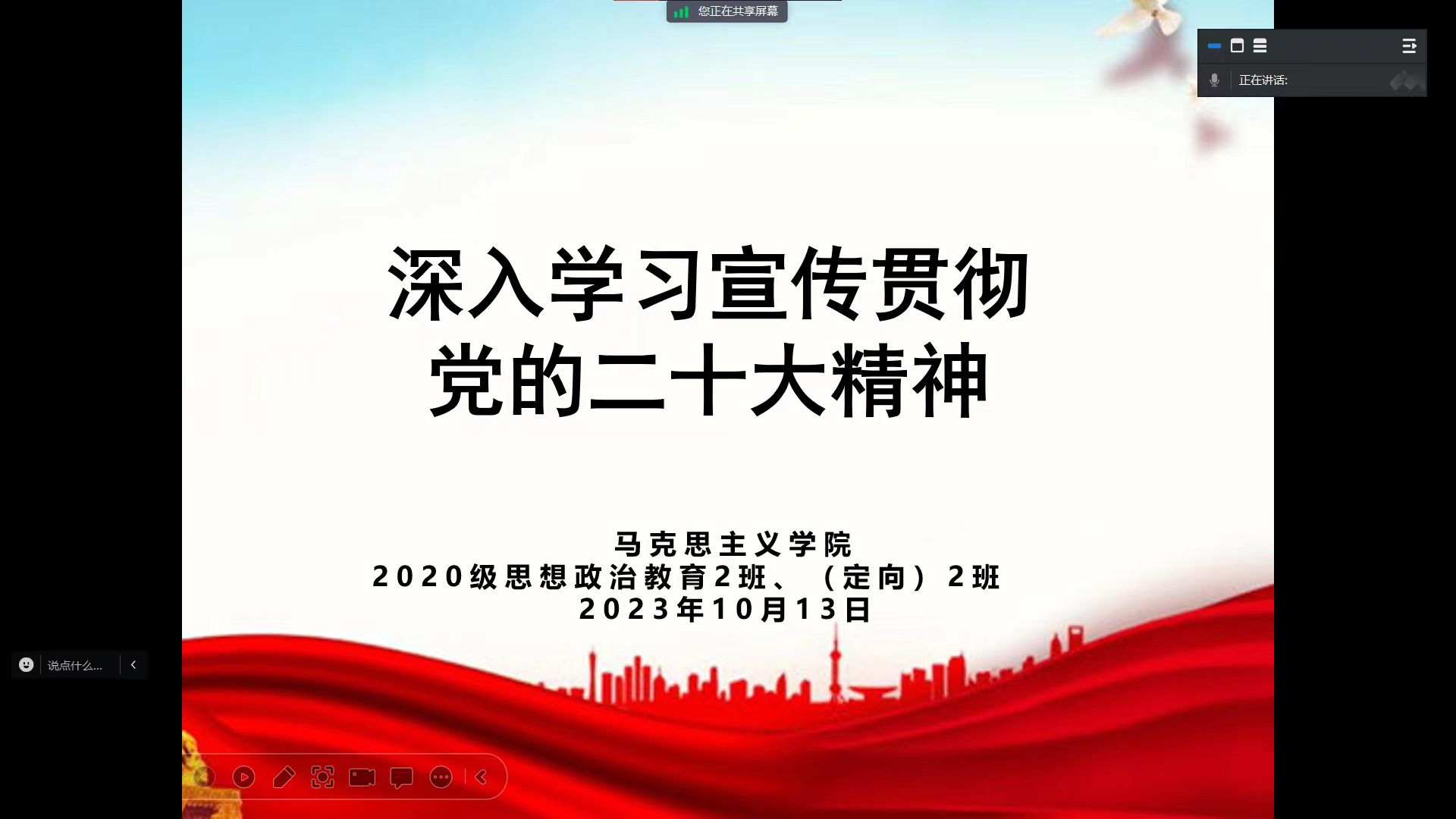 为推动主题教育进一步走深走实,10月13日下午,小说狂人 2020级思想政治教育二班、定向二班团支部通过腾讯会议开展深入学习宣传贯彻党的二十大精神主题团课。二班、定向二班团支部全体团员共同参会。团课由李晨曦、陈宇航讲授。