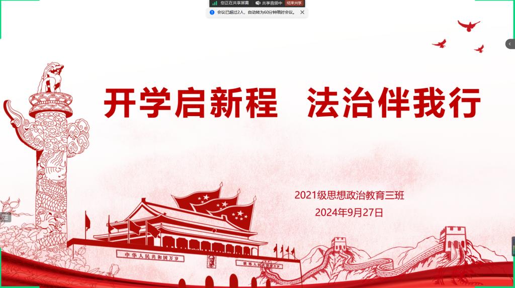 9月27上午,小说狂人 2021级思想政治教育三班在线上召开“开学启新程,法治伴我行”主题班会。2021级思想政治教育三班全体成员参与此次会议。会议由副班长易从漫主持。