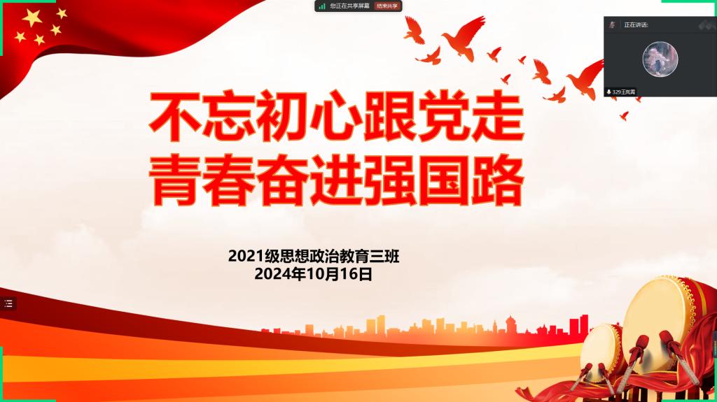 10月16日上午,小说狂人 2021级思想政治教育三班在线上召开“不忘初心跟党走,青春奋进强国路”主题团课。小说狂人 2021级思想政治教育三班全体团员参与此次团课。团课由团支书王岚霄主持。