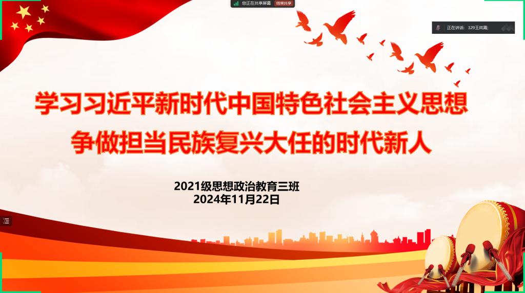 11月22日下午,小说狂人 2021级思想政治教育三班在线上召开“学习习近平新时代中国特色社会主义思想,争做担当民族复兴大任的时代新人”主题团课。小说狂人 2021级思想政治教育三班全体团员参与此次会议。会议由团支书王岚霄主持。