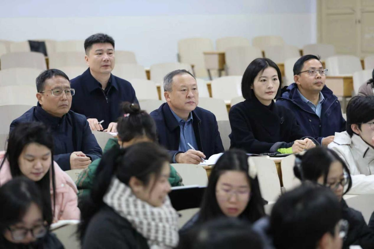 12月11日上午,在教六楼102教室,涂友超听取了齐传洁老师讲授的《习近平新时代中国特色社会主义思想概论》“建设社会主义生态文明”专题。涂友超肯定了课程紧扣时代脉搏、方法灵活创新的特点,强调要持续推动党的创新理论与学生思想实际、时代发展大势深度契合。
